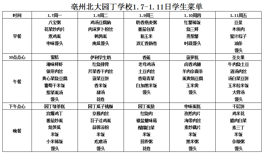亳州園丁學(xué)校3.9---3.13日菜單