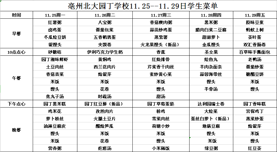 11.25--11.29日學(xué)生菜單
