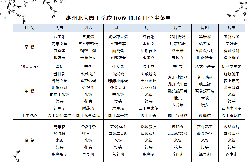 10.09-10.16日學(xué)生菜單