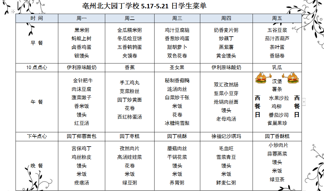 亳州園丁學校3.9---3.13日菜單