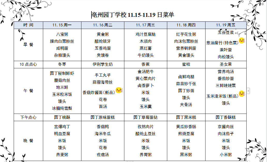 亳州園丁學校11.15-11.19日菜單