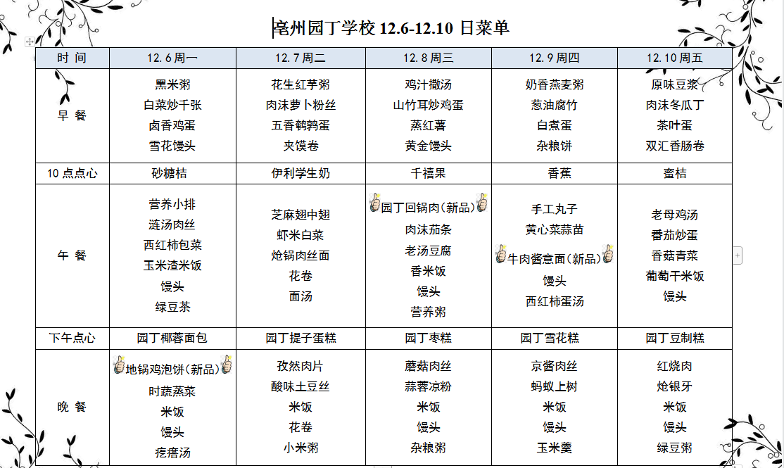 亳州園丁學校12.6-12.10日菜單