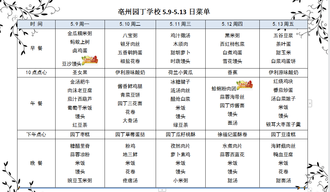 亳州園丁學(xué)校5.9-5.13日菜單
