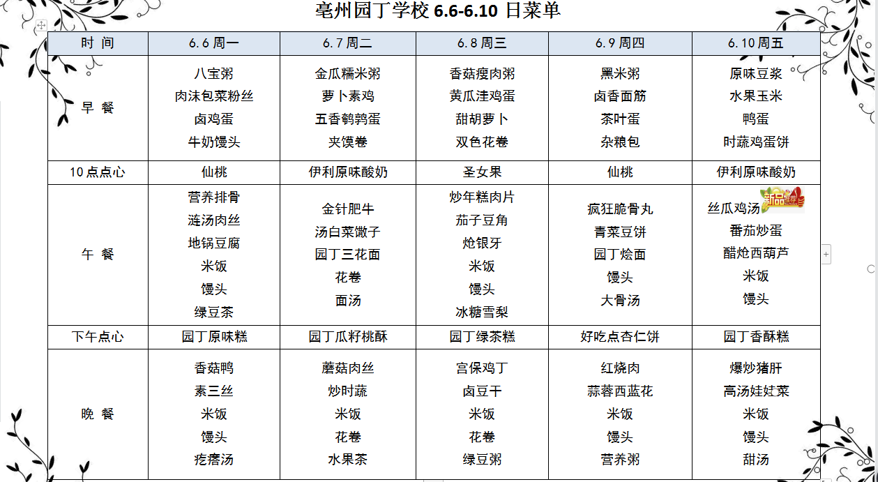 亳州園丁學校6.6-6.10日菜單