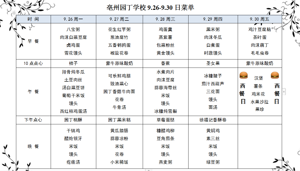 亳州園丁學(xué)校9.26-9.30日菜單