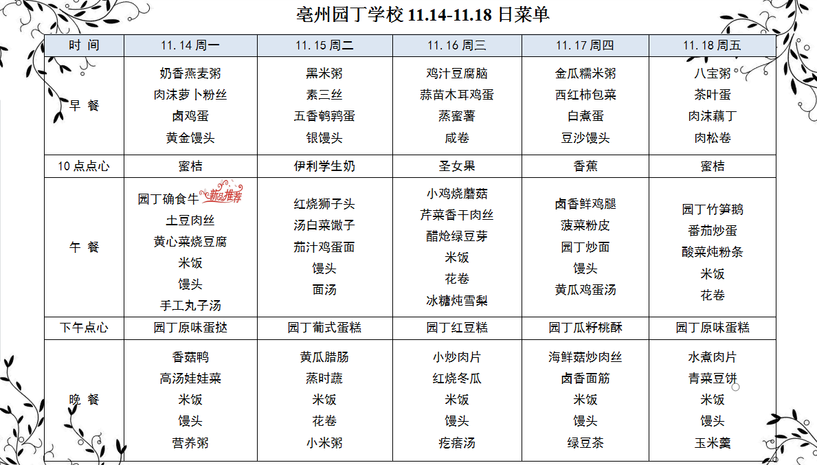 亳州園丁學校11.14-11.18日菜單
