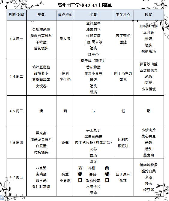 亳州園丁學(xué)校4.3-4.7日菜單