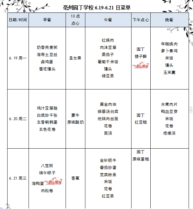 亳州園丁學(xué)校6.19-6.21日菜單