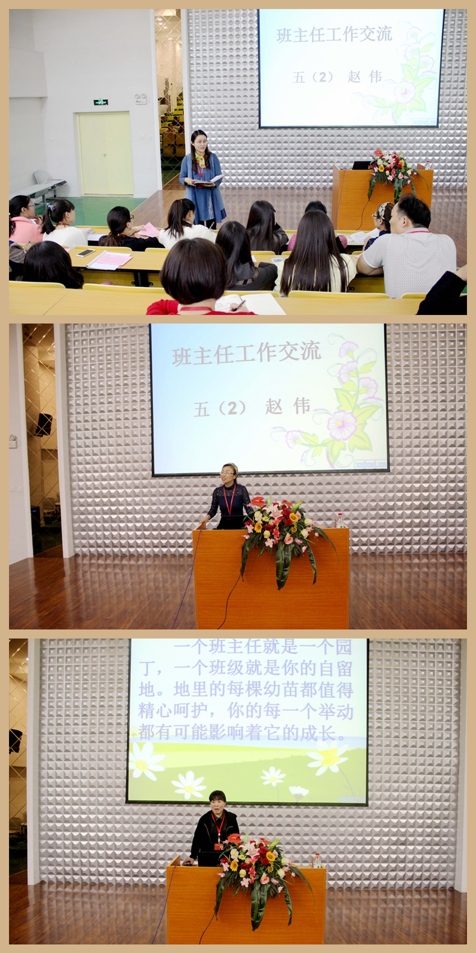 趙偉老師在培訓(xùn)中講到,在班級(jí)管理中首先要做到:1、善于走進(jìn)學(xué)生,與學(xué)生加強(qiáng)溝通,用心了解每一位學(xué)生;2、精心呵護(hù)每一位學(xué)生;3、誠(chéng)心欣賞每一位學(xué)生。