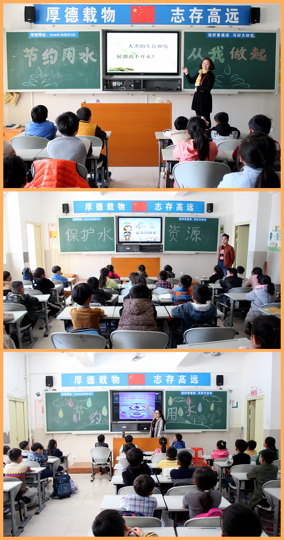 主題班會(huì)上同學(xué)們互相交流收集到的關(guān)于水資源缺乏和污染浪費(fèi)的圖片和文字資料,在共享交流中感悟水資源的珍貴。同時(shí)各班主任號(hào)召學(xué)生把節(jié)水意識(shí)傳遞給身邊的每一個(gè)人,以此活動(dòng)使學(xué)生養(yǎng)成科學(xué)、文明、節(jié)約的用水習(xí)慣。