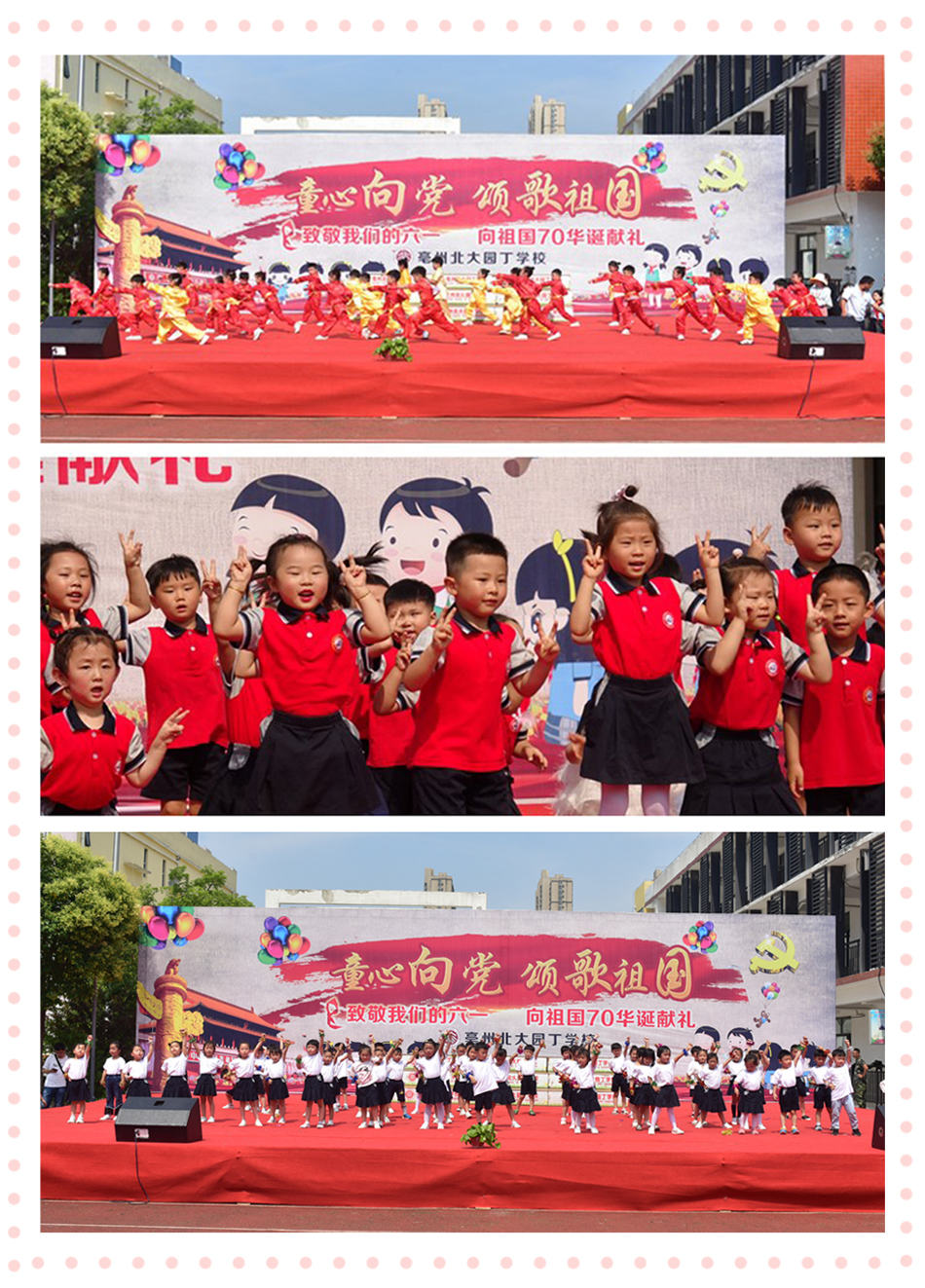伴著花的芬芳,迎著夏的陽光,同學(xué)們披上節(jié)日的盛裝,歡聚一堂。盼望中,我們迎來了又一個“六一”兒童節(jié)。為了慶祝這歡樂的節(jié)日,為了祝福祖國70華誕,5月31號上午,我們和園丁幼兒園的孩子們在這個特別的日子里舉行了“童心向黨,頌歌祖國”致敬我們的六一,向祖國70華誕獻禮文藝匯演活動。