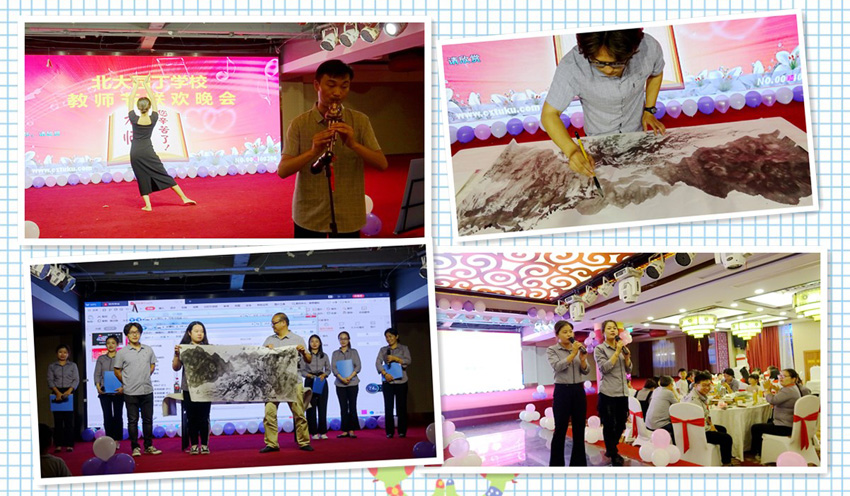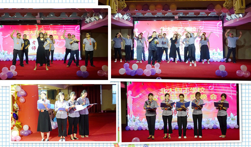 晚宴時分,全體教職工歡聚一堂,慶祝第35個教師節(jié)。宴會上,袁芳校長以一首原創(chuàng)詩開場,表達了對全體教職員工勤懇工作的認可與感激。聯(lián)歡晚會在黨員老師的一首詩朗誦中拉開帷幕,各個辦公室的才藝表演更是讓人眼前一亮:舞蹈、合唱、朗誦、配音劇、歌舞串燒、器樂表演、T臺秀、幸運抽獎、生日頒獎……節(jié)目形式多樣,內(nèi)容豐富。詹副校長宣讀的對畢業(yè)班老師的表彰決定更是將晚會氣氛推向了高潮。