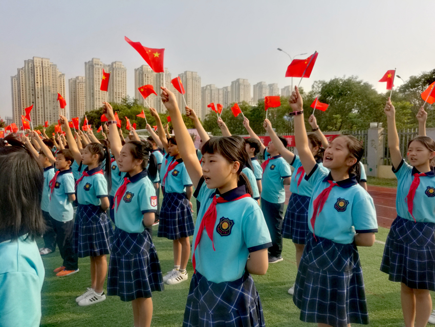 歌聲嘹亮,紅旗飛揚,隨著音樂接近尾聲,巨幅國旗緩緩從教學(xué)樓頂樓展開,北大園丁學(xué)子面向鮮艷的五星紅旗行少先隊隊禮,千人一心齊聲高呼“祝我們偉大的祖國,繁榮昌盛,國泰民安!”