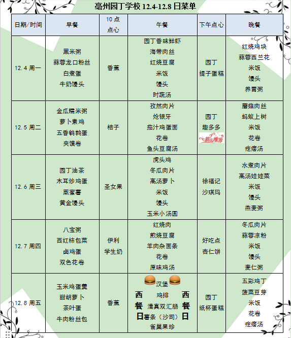 亳州園丁學校12.4-12.8日菜單