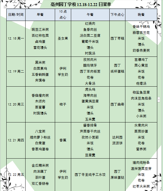 亳州園丁學(xué)校12.18-12.22日菜單