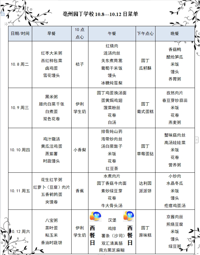 亳州園丁學(xué)校10.8---10.12日菜單