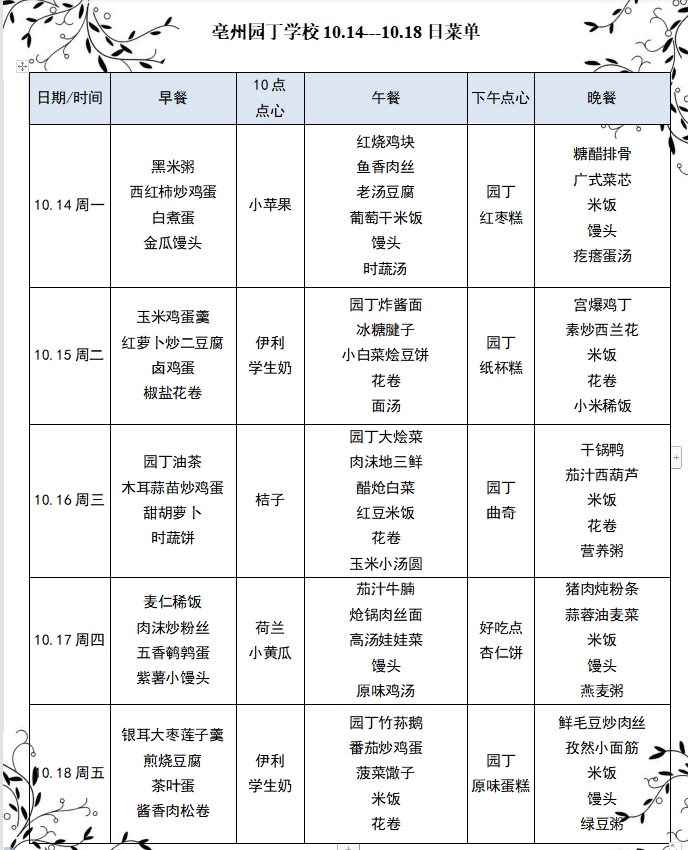 亳州園丁學(xué)校10.14---10.18日菜單