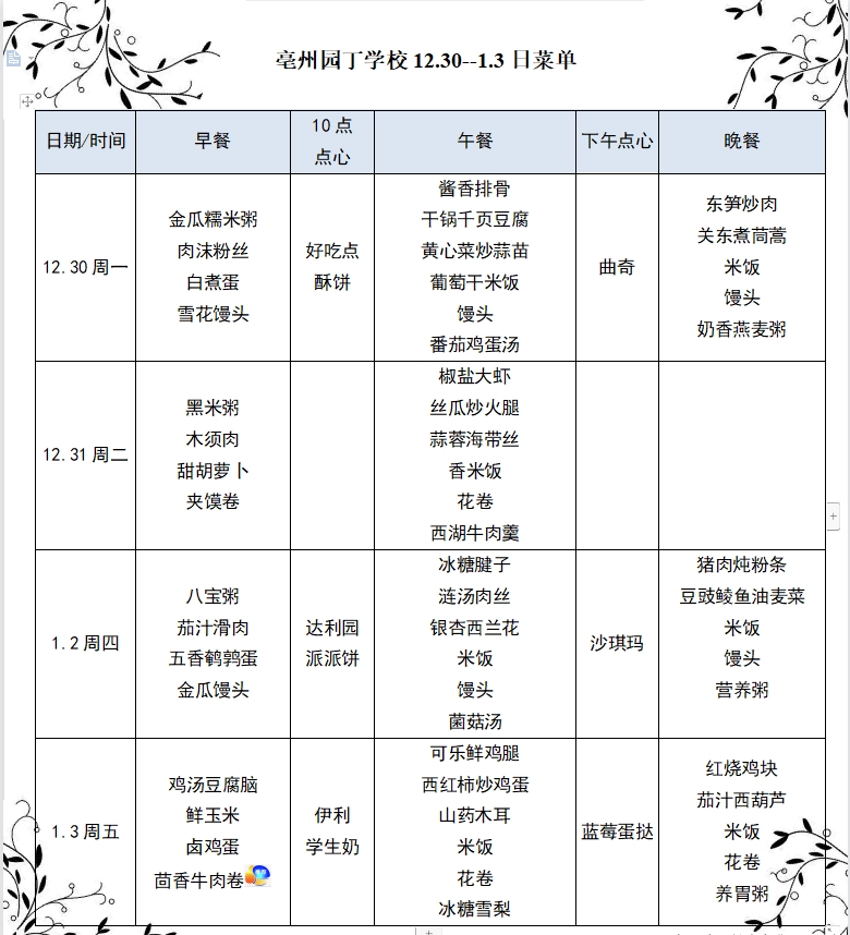 亳州園丁學校12.30--1.3日菜單