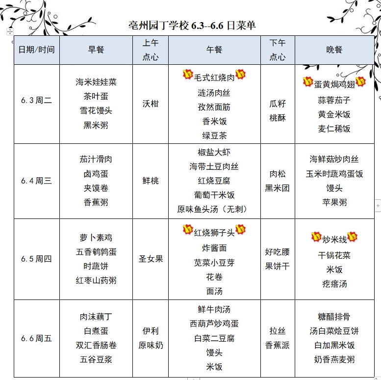 亳州園丁學(xué)校6.3--6.6日菜單