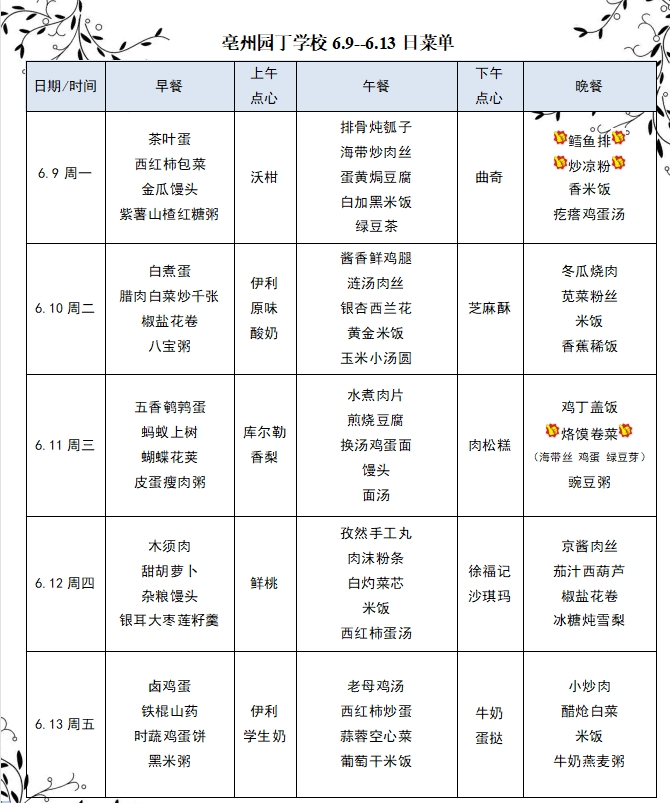 亳州園丁學(xué)校6.9--6.13日菜單