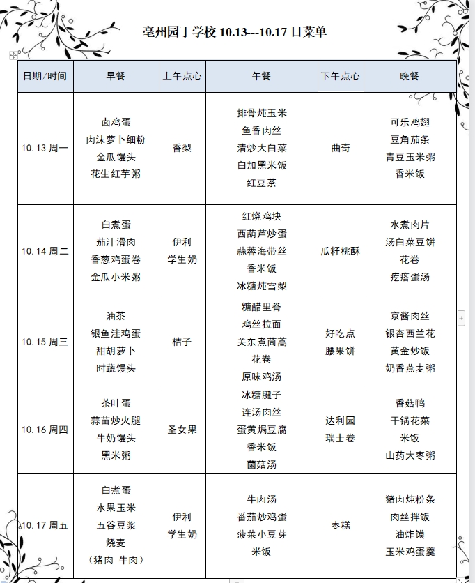 亳州園丁學(xué)校10.13---10.17日菜單