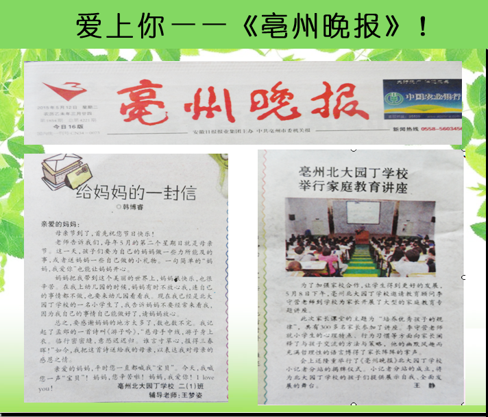 為了加強(qiáng)家校合作,讓學(xué)生得到更好的發(fā)展,5月8日下午,我校邀請了著名教育顧問李守營老師為家長家庭教育專題講座,受邀的四百多名家長在當(dāng)日下午早早地來到了學(xué)校。在以《培養(yǎng)優(yōu)秀孩子的規(guī)律》主題培訓(xùn)會上,李守營老師就小學(xué)生的心理特點(diǎn)、行為習(xí)慣等方面向家長闡述了與孩子交流的方法與策略,他幽默風(fēng)趣而充滿哲理性的語言博得了家長陣陣掌聲,該活動刊登在5月12日的《亳州晚報(bào)》上。無獨(dú)有偶,我校二(1)班韓博睿同學(xué)的文章《給媽媽的一封信》也發(fā)表在同一天的《亳州晚報(bào)》上。