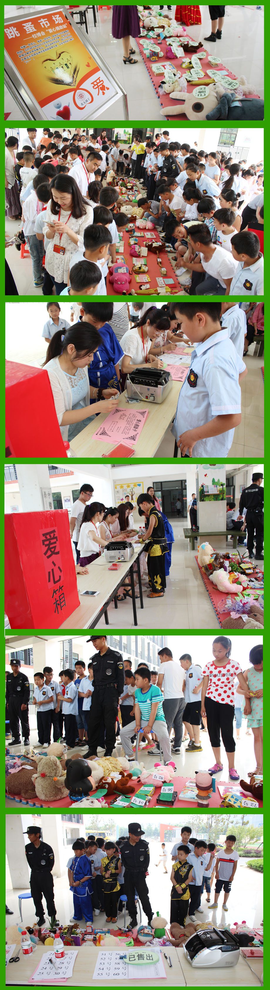 所有物品都被編上編號,整齊干凈的排放著,每件物品上都貼著原主人的寄語,每條寄語都是那么得溫馨。十點鐘,同學(xué)們有秩序地排隊,挑選自己心儀的物品并向負責(zé)老師登記編號,之后根據(jù)物品的價格把相應(yīng)的錢捐入愛心捐贈箱里。由于同學(xué)們的積極參與,短短的半個小時,八十多件物品全部售出。買到物品的同學(xué)非常開心,因為他們能以低于市場3-4倍的價格買到自己喜愛的物品,賣物品的同學(xué)也非常開心,因為他們曾經(jīng)的“好伙伴”有了新的“朋友”。最值得高興的是,他們都捐獻了愛心,幫助了弱勢兒童。為了保障學(xué)生的安全,學(xué)校還特意請來了帥氣的特警叔叔,為同學(xué)們保駕護航。