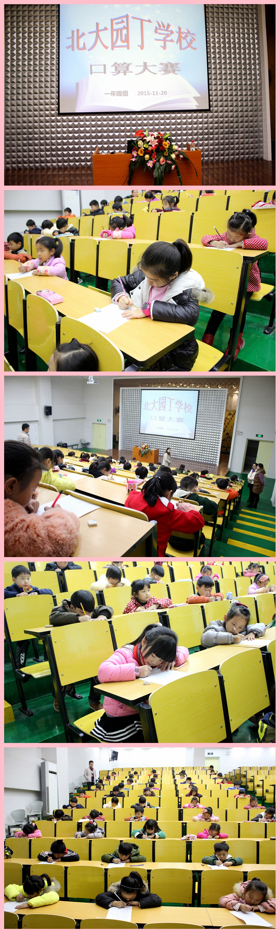 本次比賽活動由數(shù)學(xué)教研組具體負(fù)責(zé)實(shí)施,比賽采用計時口算的方式,共130道口算題,包含了一年級近階段所學(xué)的10以內(nèi)的所有口算內(nèi)容,既有10以內(nèi)數(shù)的加減,又有10以內(nèi)數(shù)的加減混合運(yùn)算。此次比賽時間為10分鐘, 賽題具有靈活性的同時,又有一定的量和一定的難度。比賽開始的號令一響,孩子們拿起筆飛快地口算起來,10分鐘的時間轉(zhuǎn)瞬即逝,從孩子們緊張的表情中,可以感受到他們奮勇爭先的決心和信心。