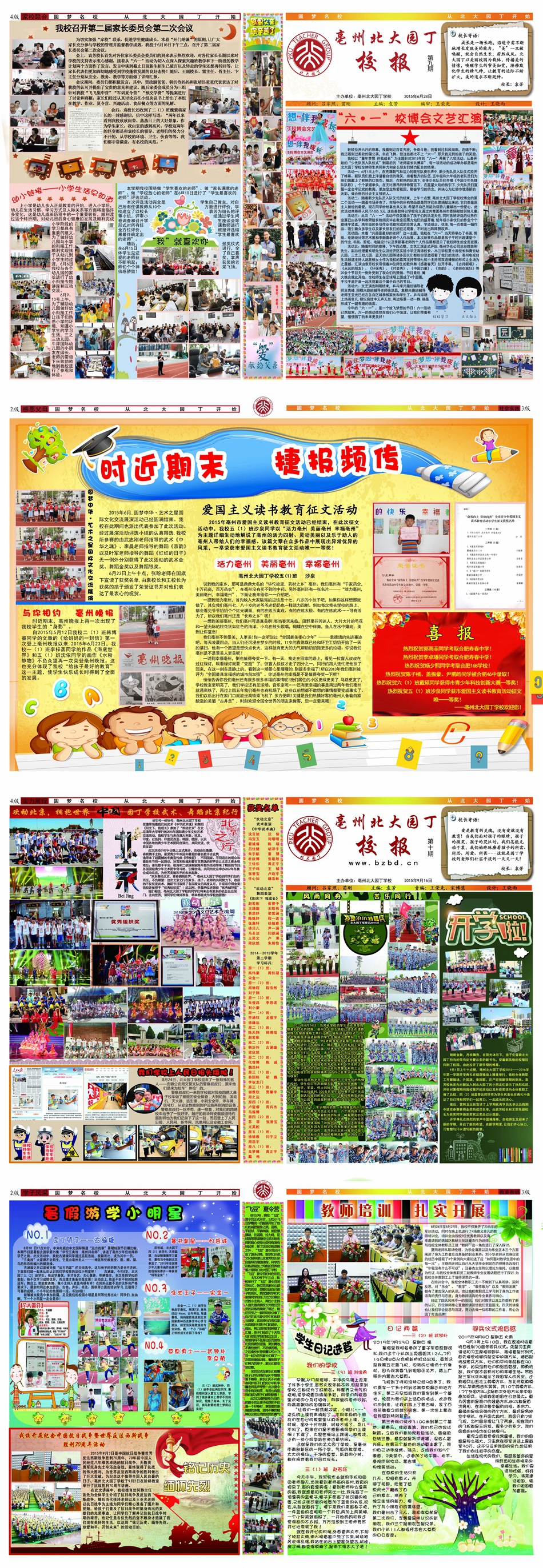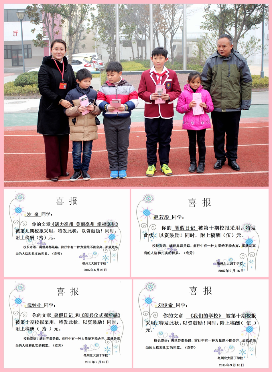 經(jīng)校報(bào)評(píng)委會(huì)對(duì)被第九期、第十期校報(bào)錄用作品進(jìn)行認(rèn)真評(píng)選后,共評(píng)出獲獎(jiǎng)學(xué)生4位,分別是——第九期:六(1)班沙泉同學(xué)的《活力亳州 美麗亳州 幸福亳州》;第十期:三(1)班趙若彤同學(xué)的《暑假日記》;三(2)班武鐘樸同學(xué)的《閱兵儀式觀后感》以及三(3)班劉俊希同學(xué)的《我們的學(xué)?!贰?/span>