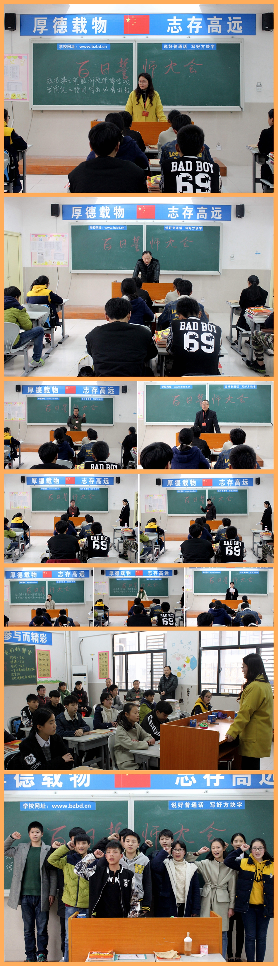 周一下午班會時間,初三畢業(yè)生在教室里舉行了百日誓師大會。第7節(jié)剛上課,初三全體同學(xué)和科任老師就已經(jīng)端坐好了,大家懷著激動的心情等待著誓師大會的開始。