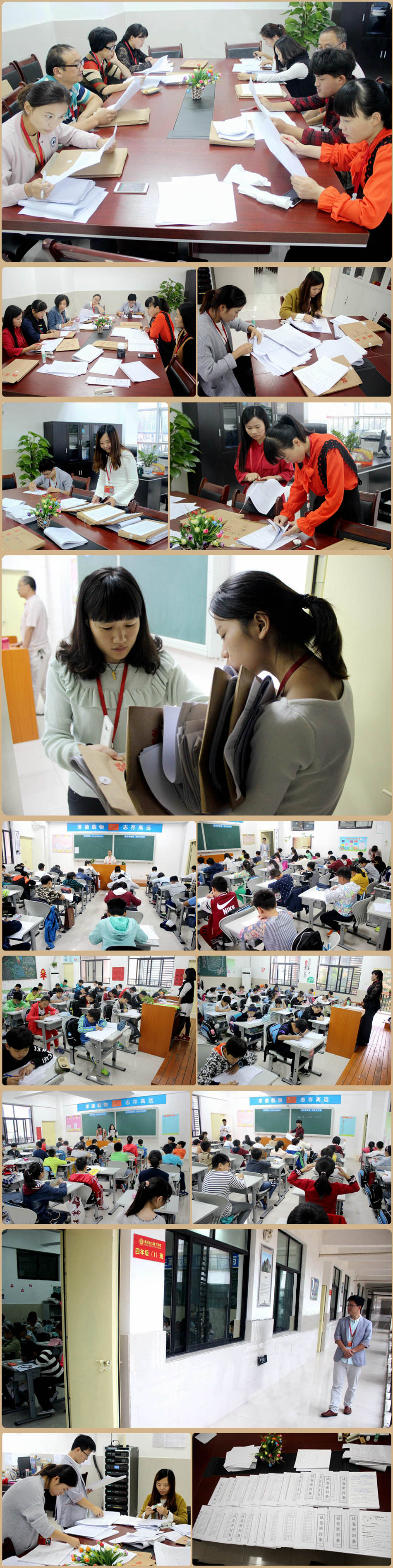學(xué)生們積極備考,認真復(fù)習(xí)。開考前教務(wù)處安排人員將試卷派發(fā)到各個考場??荚囬_始,學(xué)生們迅速進入緊張狀態(tài),奮筆疾書的寫了起來。期間,監(jiān)考教師手機一律設(shè)置靜音或振動狀態(tài),不玩手機、不看書報、不研究試卷、不交談、不來回走動、不做與監(jiān)考無關(guān)的事,切實履行監(jiān)考職責。兩位監(jiān)考前站后坐,30分鐘一輪換。雷輝龍主任到場巡視檢查,端正考風(fēng),嚴肅考紀??纪甑谝粓稣Z文,孩子們走出考場,長吁了口氣,從剛才緊張的氣氛中解脫出來,放松心情,迎接下面的考試。交卷后,監(jiān)考教師認真按考號排序并及時復(fù)查,防止出現(xiàn)試卷顛倒和序號排錯現(xiàn)象。試卷規(guī)整好送到教務(wù)處,由教務(wù)處統(tǒng)一裝訂并安排老師進行批改。