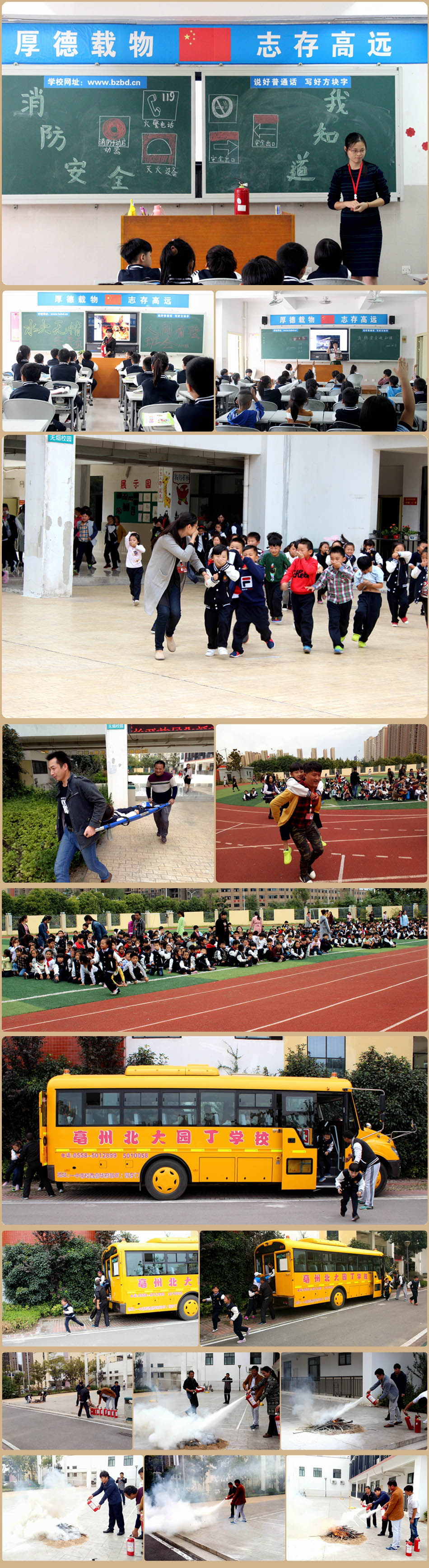 10月10日下午3點(diǎn),刺耳的警報(bào)突然響起,各班學(xué)生在老師的帶領(lǐng)下,捂著口鼻,迅速有序地從指定疏散通道逃離教學(xué)樓,并迅速到達(dá)操場蹲下等待并清點(diǎn)各班人數(shù),整個疏散過程用時(shí)2分20秒。醫(yī)療救護(hù)人員也及時(shí)到位,緊急救護(hù)“傷員”。隨后,現(xiàn)場點(diǎn)起了火堆,袁芳校長和老師們一起體驗(yàn)如何使用滅火器。最后,還組織了校車突發(fā)情況下的模擬逃生演練,整個過程有條不紊。