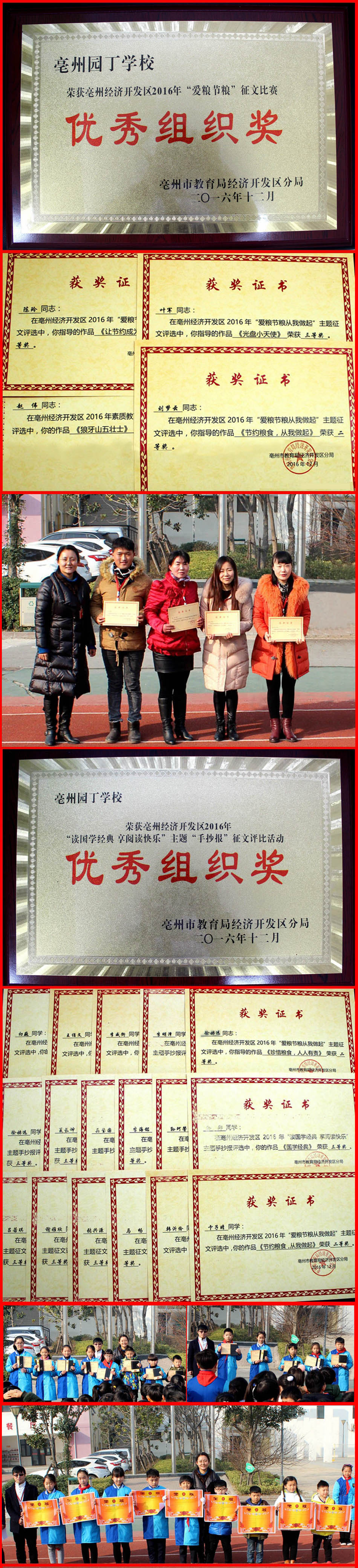近日,由經(jīng)開區(qū)教育分局組織的多項征文活動傳來了喜訊。我校在以“愛糧食從我做起”、“讀國學經(jīng)典,享閱讀快樂”為主題的征文活動中喜獲佳績。多名學生在此次活動中取得了優(yōu)異的成績,部分老師也獲得了優(yōu)秀教師輔導(dǎo)獎。同時,我校還分獲兩項活動的優(yōu)秀組織獎。