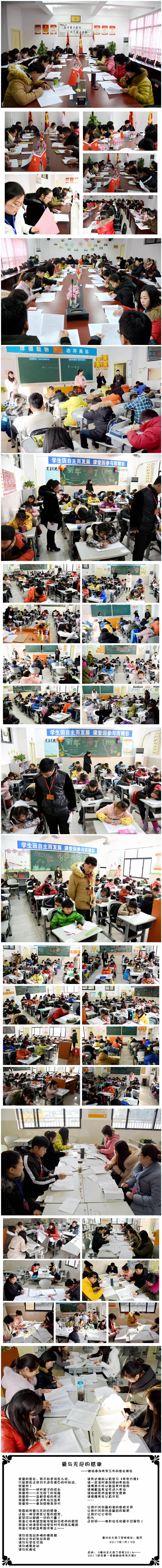2017年1月13日,我校如期舉行“2016——2017學年第一學期期末考試”??荚嚽捌冢诮虅仗幚纵x龍主任的精心安排下,整個考務過程井然有序,從試卷的分裝與保密、考場的布置要求、監(jiān)考要求、裝訂與密封試卷、批閱試卷、審核試卷、拆封試卷到最后的輸分統(tǒng)計,全體教師嚴守職責,一絲不茍,使考試非常順利。此次考試依然采取了我校一貫的作風,讓家長全程參與整個考務工作,從考前會、到監(jiān)考家長朋友們也是絲毫不遜色,有模有樣,非常認真;監(jiān)考完畢的閱卷,拆封試卷、輸分都有家長參與,甚至我們還安排了家長和學校領導一起巡視、監(jiān)督各監(jiān)考教師的監(jiān)考行為。