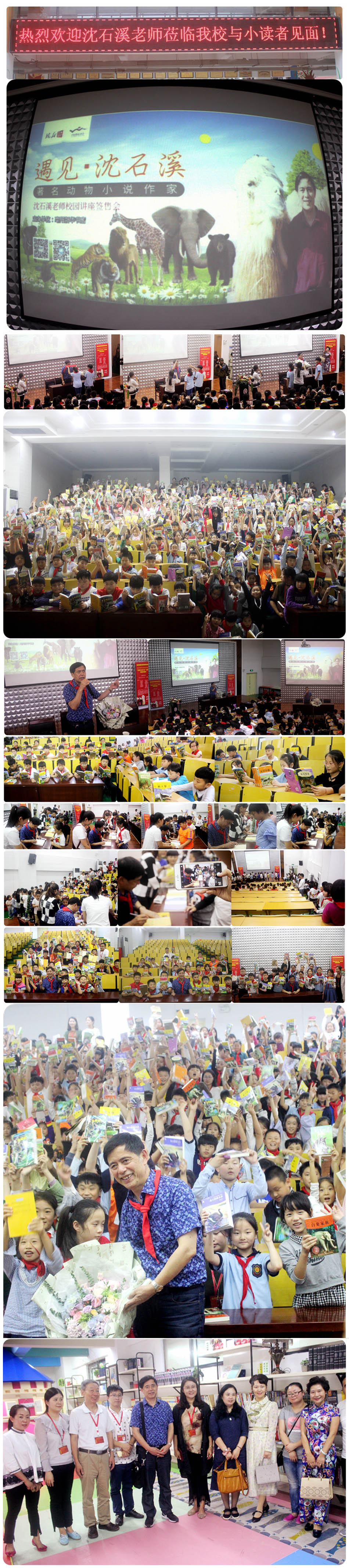 下午兩點(diǎn),沈老師準(zhǔn)時(shí)來到多媒體報(bào)告廳,少先隊(duì)員為他送上了鮮花,掌聲四起,現(xiàn)場一片沸騰。佩戴著鮮艷紅領(lǐng)巾的沈老師繪聲繪色地講述了自己年輕時(shí)在云南插隊(duì)時(shí)的親身經(jīng)歷:打孔雀遇見了六匹狼,被困樹上兩天兩夜......沈老師語言幽默風(fēng)趣,故事新鮮有趣、驚險(xiǎn)刺激,懸念設(shè)置巧妙,同學(xué)們聽得津津有味,笑得前仰后合。沈老師結(jié)合自己30多年的創(chuàng)作經(jīng)歷告訴同學(xué)們:1.生活是創(chuàng)作的源泉,從親身經(jīng)歷的生活開始寫起。2.做生活中的有心人,睜大你的慧眼,積累生活中生動有趣的寫作素材。3.寫作就好比是一只鳥兒,需要兩只翅膀同時(shí)振動才能飛得更好更遠(yuǎn)!一只翅膀是生活的經(jīng)歷和積累,一只翅膀是豐富的想象力!最后,沈老師樂此不疲的一一在同學(xué)們的新書上進(jìn)行了簽名,還耐心的詢問了孩子們的學(xué)習(xí)情況,并熱情的與他們合影留念。